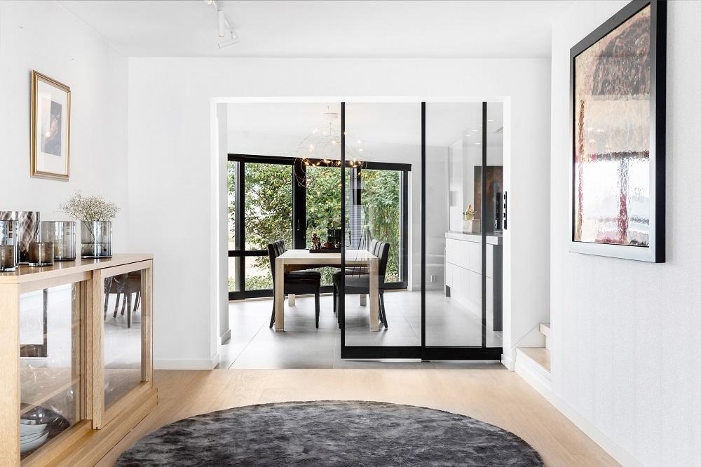 I små leiligheter eller rekkehus er dette en måte å få fleksibilitet uten å måtte bygge om. En stilren skyvedør inne i glass gir dessuten mer lysinnfall enn en tett dør, noe som gjør kjøkkenet både mer innbydende og mer funksjonelt.